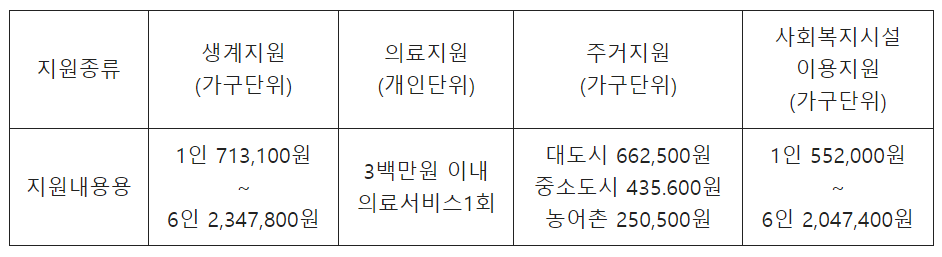재산 기준: 일반재산과 금융재산을 합산한 후, 주거용 재산을 공제하고 부채를 뺀 금액이 일정 기준 이하일 때 지원받을 수 있습니다.